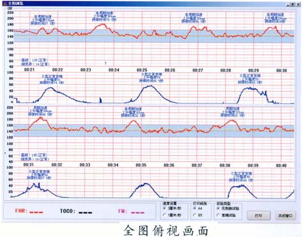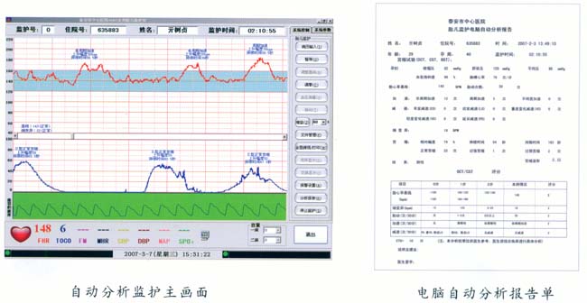 在監(jiān)護(hù)中對(duì)胎心率基線(xiàn)、細(xì)變異大小、加速、各種減速及胎動(dòng)的變化進(jìn)行實(shí)時(shí)在線(xiàn)分析,并將分析結(jié)果顯示在屏幕上,監(jiān)護(hù)結(jié)束時(shí)對(duì)所有的監(jiān)護(hù)信息進(jìn)行綜合分析,給出監(jiān)護(hù)診斷結(jié)果及胎兒評(píng)分供臨床參考,使得每個(gè)婦產(chǎn)科大夫都能輕松進(jìn)行胎兒監(jiān)護(hù)圖形分析和診斷。