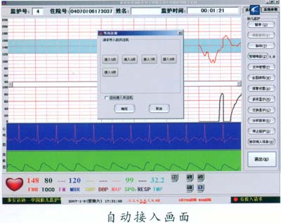 床邊機(jī)一開(kāi)機(jī)進(jìn)入監(jiān)護(hù)狀態(tài),孕婦的住院號(hào)、姓名及各種監(jiān)護(hù)信息自動(dòng)的傳到中央監(jiān)護(hù)主機(jī)上,自動(dòng)啟動(dòng)中央監(jiān)護(hù)工作站開(kāi)始監(jiān)護(hù),監(jiān)護(hù)結(jié)束后自動(dòng)存儲(chǔ)監(jiān)護(hù)信息, 實(shí)現(xiàn)了自動(dòng)監(jiān)護(hù)無(wú)人值班,極大方便了臨床應(yīng)用。