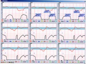 可以同屏顯示長(zhǎng)達(dá)一小時(shí)的監(jiān)護(hù)信息,對(duì)監(jiān)護(hù)信息縱覽無(wú)疑,對(duì)整個(gè)監(jiān)護(hù)信息的觀(guān)察分析診斷極為方便。